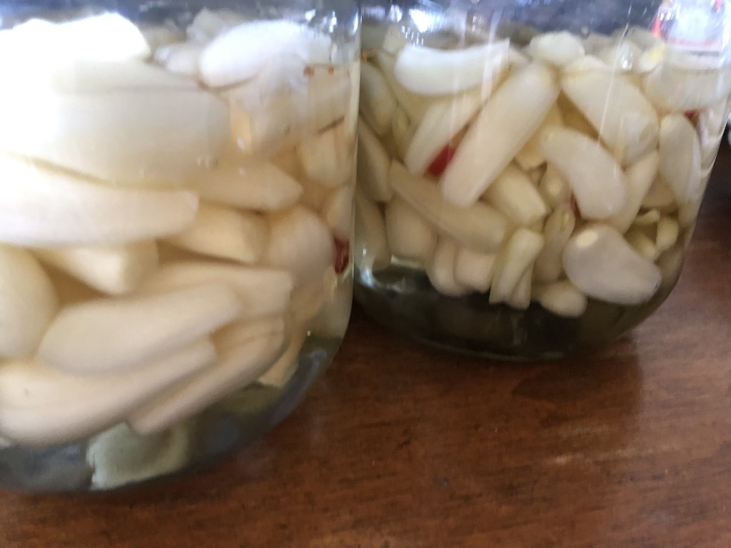 砂付きラッキョの処理を遅くに始めた結果、日を跨いでしまい疲れた 腰もいたくなるしですが、出来上がりは二週間後、カレーライスだ!