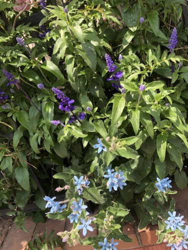 バラの根方に植え込まれたブルーの色合いが素敵な小さな花