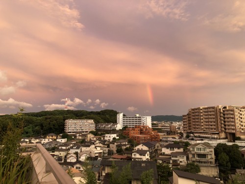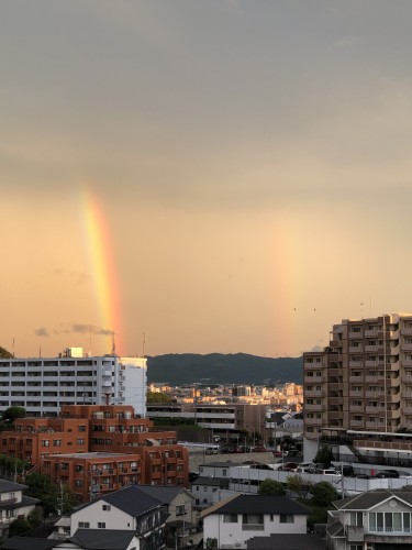 台風の尾の中にいる時、空が美しい変化を見せる 小笹夕焼けに染まる中、二本の虹がかかる 長尾1丁目樋井川夕景