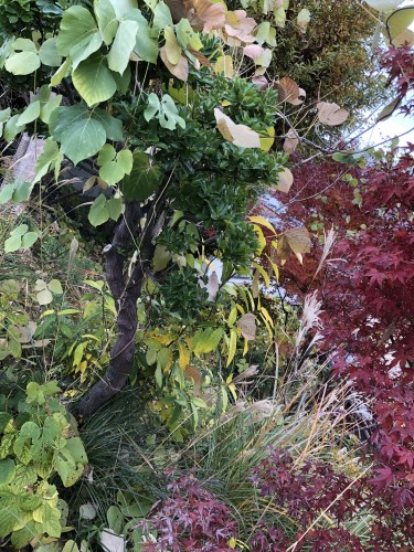 庭の雑草をまめに取ってらしたご主人の後、手が回らなくなった庭に葛の葉が繁茂して絡みついています コンビニの灯りがクリスマスです