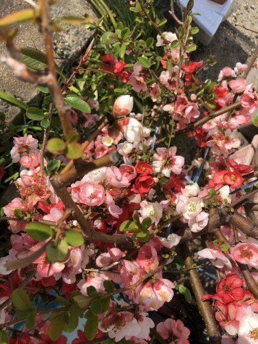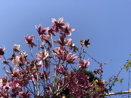 道の脇に散らばる花弁があるので坂道の途中で見上げたら紫花モクレン咲ききったた感満載 赤とピンクのボケ 赤紫モクレンの側にもあった 帰って来たら一汗かいていた 春